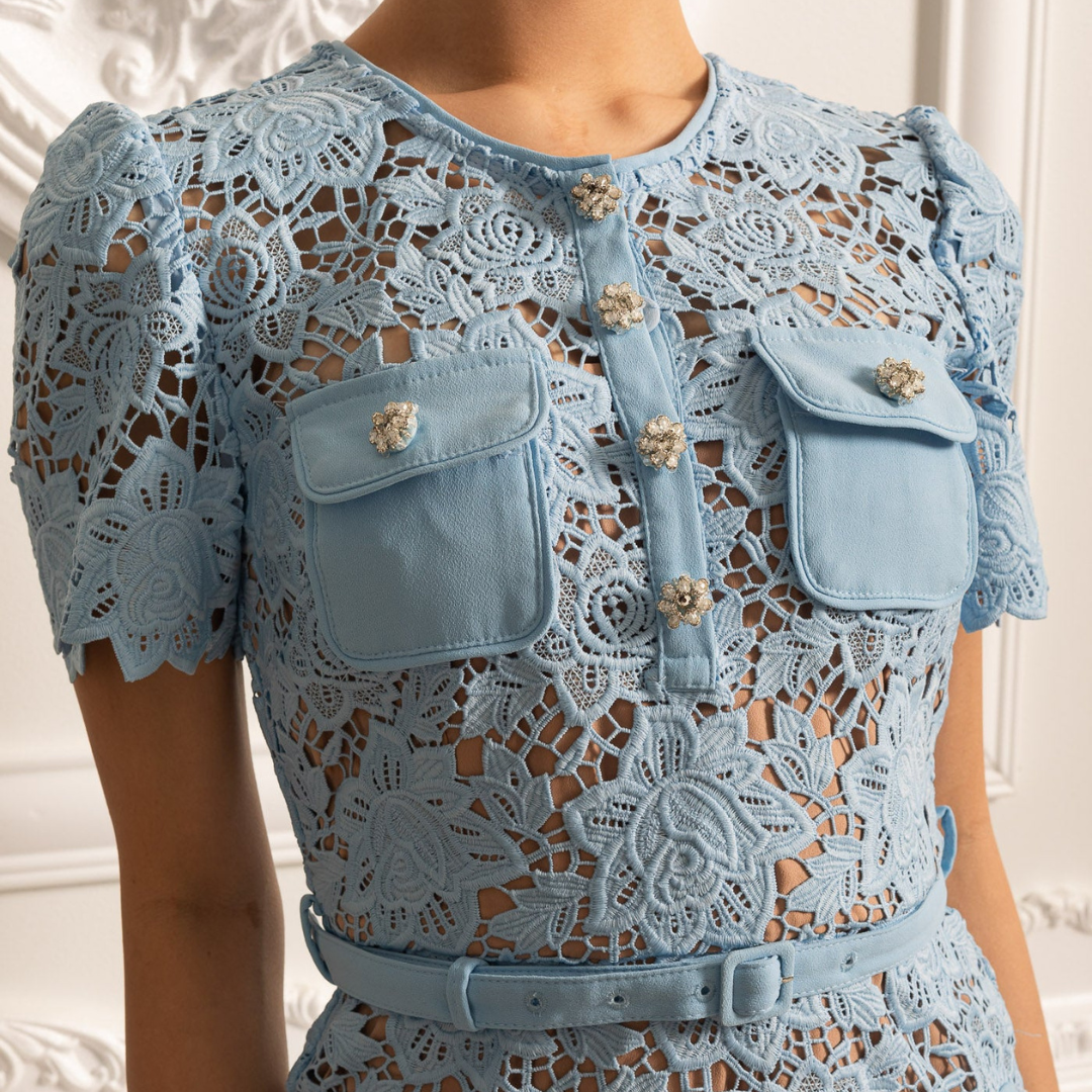 Dieses kurz geschnittene Spitzenkleid vereint feminine Raffinesse mit modernem Tailoring. Vier dekorative Pattentaschen, ein taillierter Gürtel und die kunstvoll gearbeitete florale Spitze sorgen für einen Look voller Eleganz und Stärke. Perfekt für besondere Anlässe, elegante Empfänge oder stilvolle Auftritte mit modischem Statement.