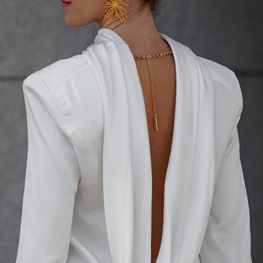 • Lange Ärmel mit schmalem Schnitt – schaffen einen eleganten Kontrast zum tiefen Rücken.