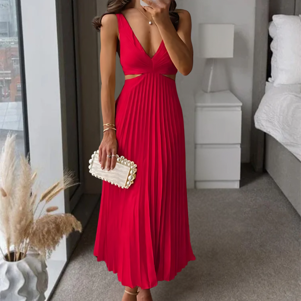 Suchst du ein elegantes und verführerisches Kleid für den Sommer? Das Caroline Maxi Kleid kombiniert einen tiefen V-Ausschnitt mit einem hoch taillierten, figurschmeichelnden Schnitt, der deine Silhouette perfekt betont. Die luftige, ärmellose Passform und die zarten Plisseefalten sorgen für einen edlen Look, während der leichte Stoff maximalen Tragekomfort bietet. Perfekt für Strandtage, Partys oder besondere Anlässe.