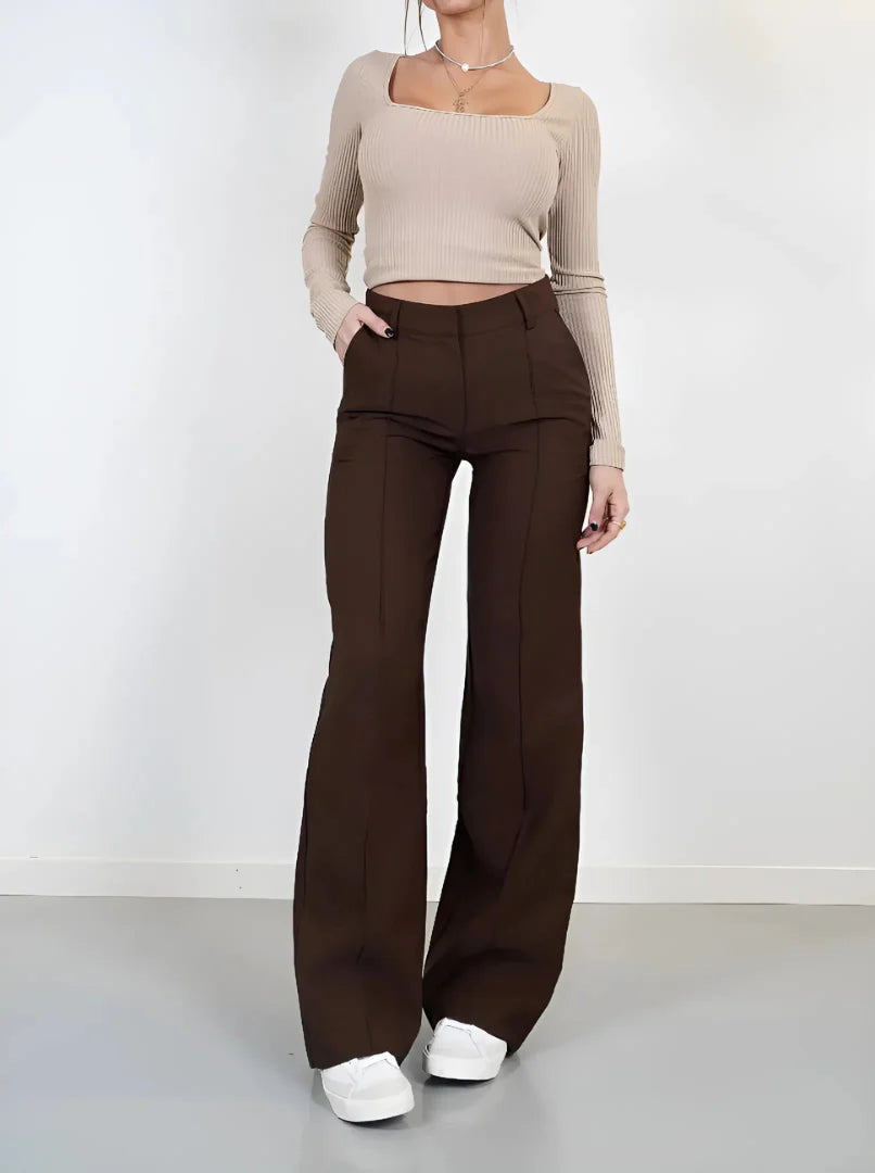 Fühlen Sie sich schick und bequem in der Éclat-Hose. Mit einem hochgeschnittenen Design, das die Silhouette schmeichelt, und weit fließenden Beinen formt diese Hose die Figur und bietet gleichzeitig außergewöhnlichen Komfort. Perfekt sowohl für legere Anlässe als auch für elegante Looks – sie vereint Stil und Praktikabilität mühelos.